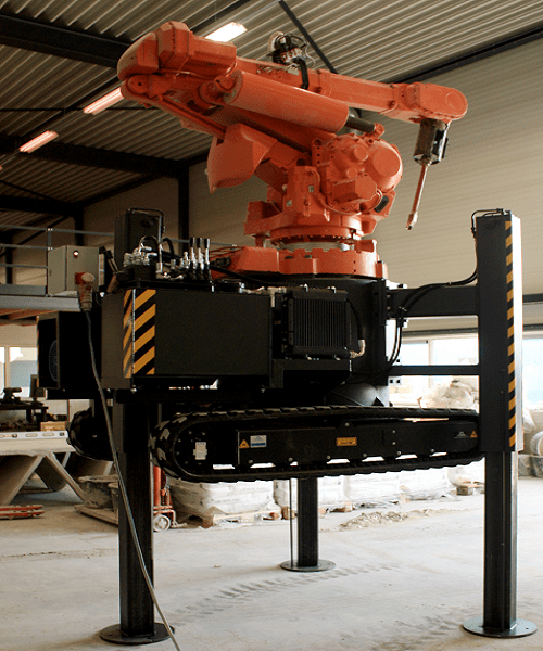 Dermed står vi med en unik konstellation for at …. En robotarm bevæger sig frem og tilbage over et område, mens den sprøjter beton ud ifølge det mønster, som arkitekttegningen dikterer.